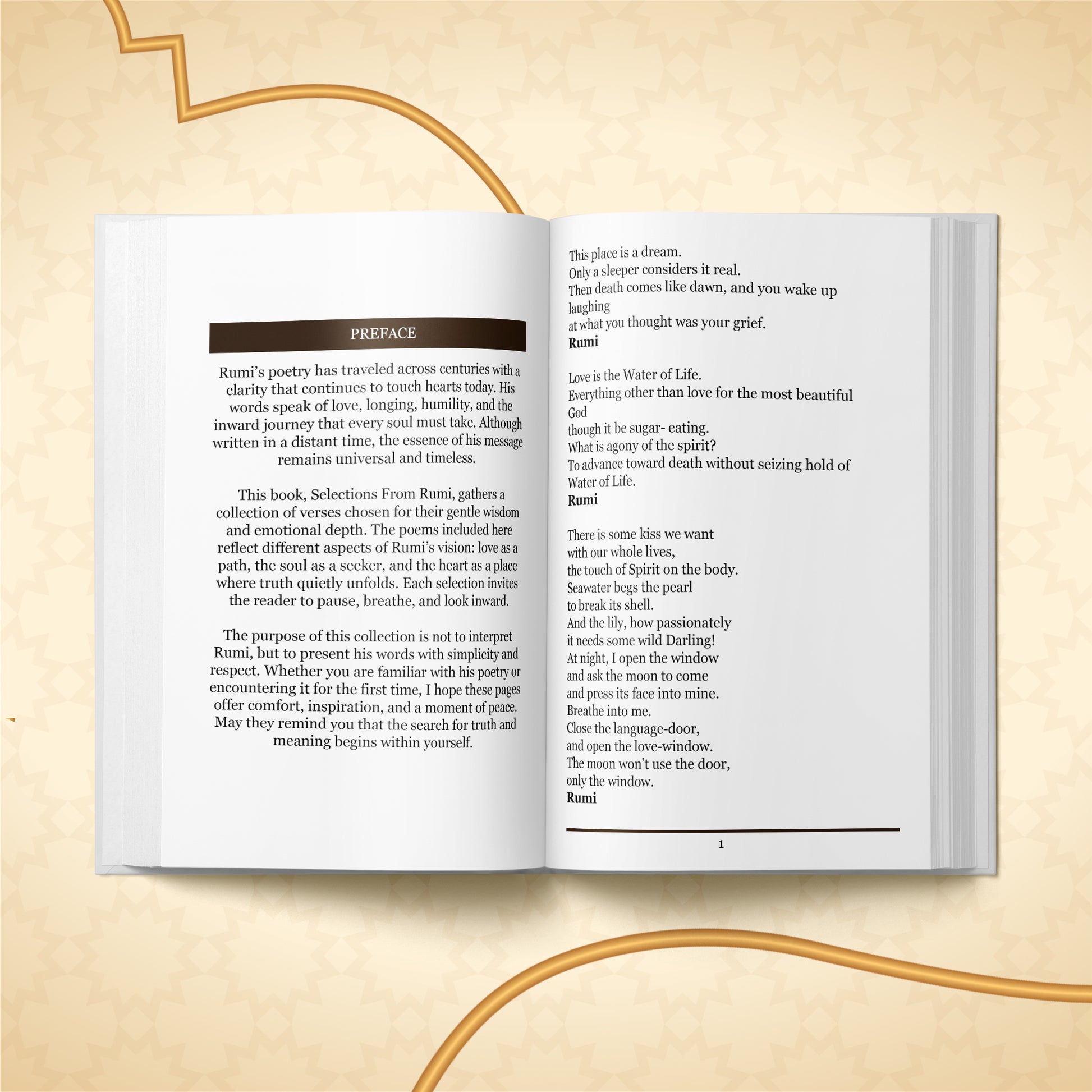 “Selections From Rumi – The Path of Love & Wisdom” presents a timeless collection of Rumi’s most profound and spiritually rich verses, curated to capture the essence of his message for the modern reader.
